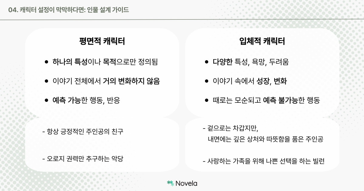 입체적인 캐릭터는 마치 실제 사람처럼 다양한 면모와 깊이를 가지고 있어요.