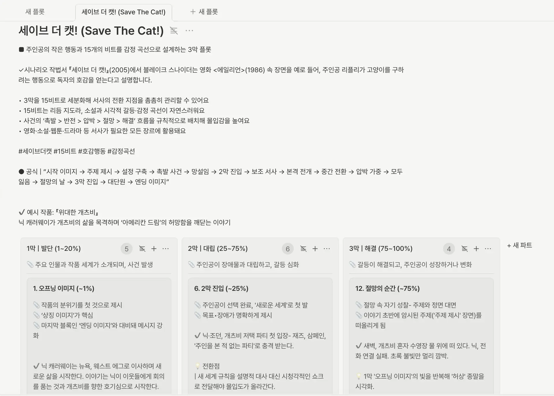 그래서 이야기 창작 도구 노벨라(Novela)에서는 ‘세이브 더 캣’ 플롯 템플릿을 준비했어요. (자세한 설명은 이용가이드 참고하기!)