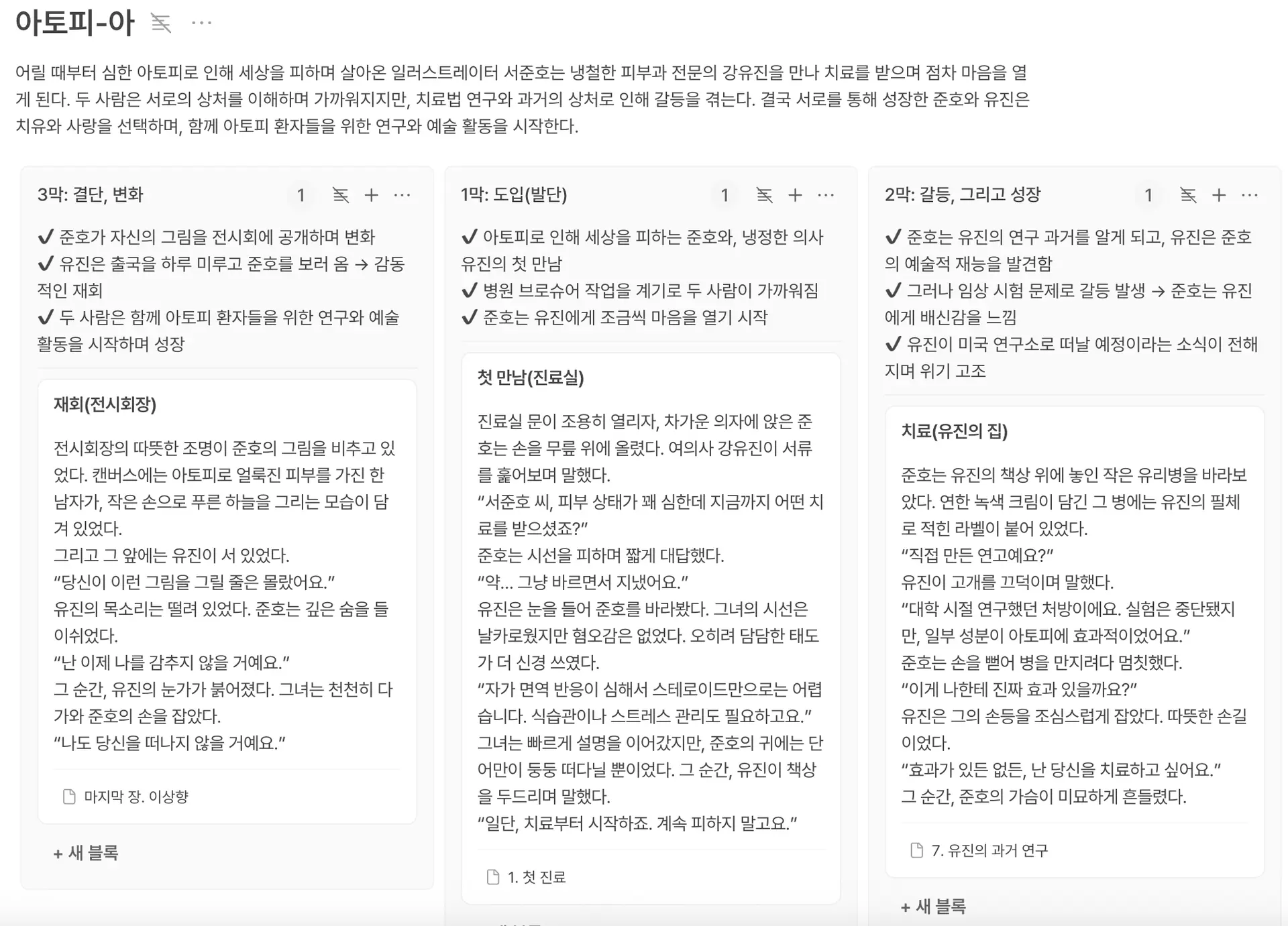 터 정보를 표로 정리하거나, 장별 진행 상황을 칸반보드로 관리할 수도 있죠. 템플릿을 만들어두면 매번 똑같은 구조로 작업할 수 있어서 편리하죠.